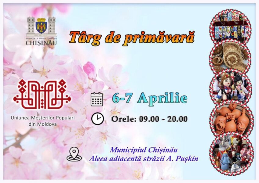 În Scuarul Catedralei Mitropolitane „Nașterea Domnului” – pe aleea adiacentă str. Al. Pușkin, în perioada 06-07 aprilie 2024 (09:00-20:00) – Târg de Primăvară, cu articole meșteșugărești și de artizanat, organizator: AO „Uniunea Meșterilor Populari din Moldova”.
