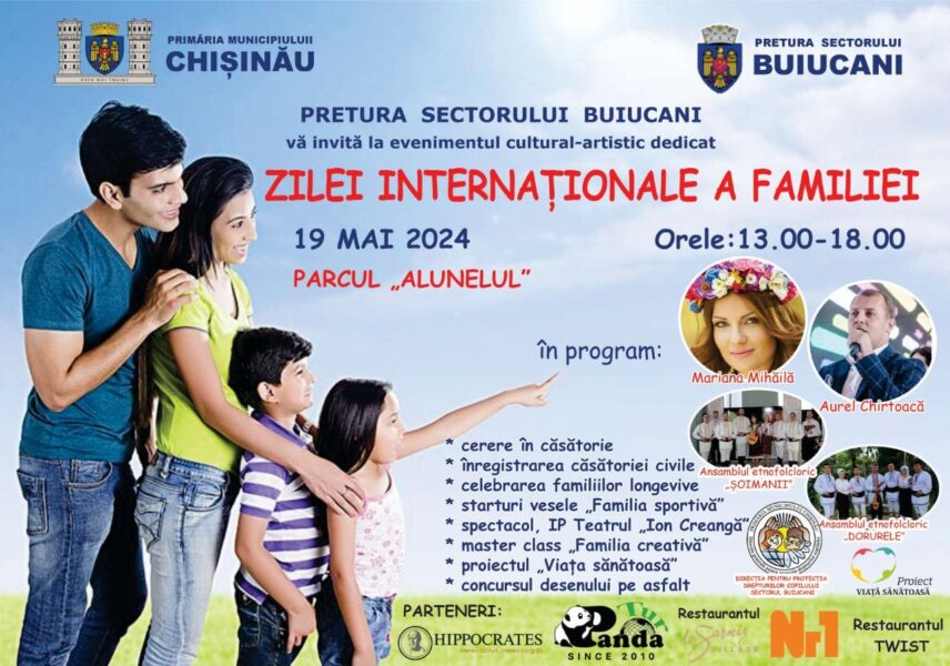 Pretura sectorului Buiucani, în comun cu Direcţia Protecţia Copilului Buiucaniși Oficiul Stării Civile Buiucani vă invită să sărbătorim Ziua Internațională a Familiei într-un mod special, la aer liber, în Parcul „Alunelul”.