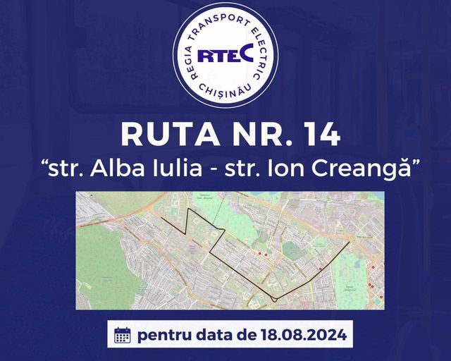 Pentru acoperirea cu transport public a sectorului de drum afectat de modificările operate, se instituie temporar pentru data de 18.08.2024 ruta de troleibuz nr. 14: