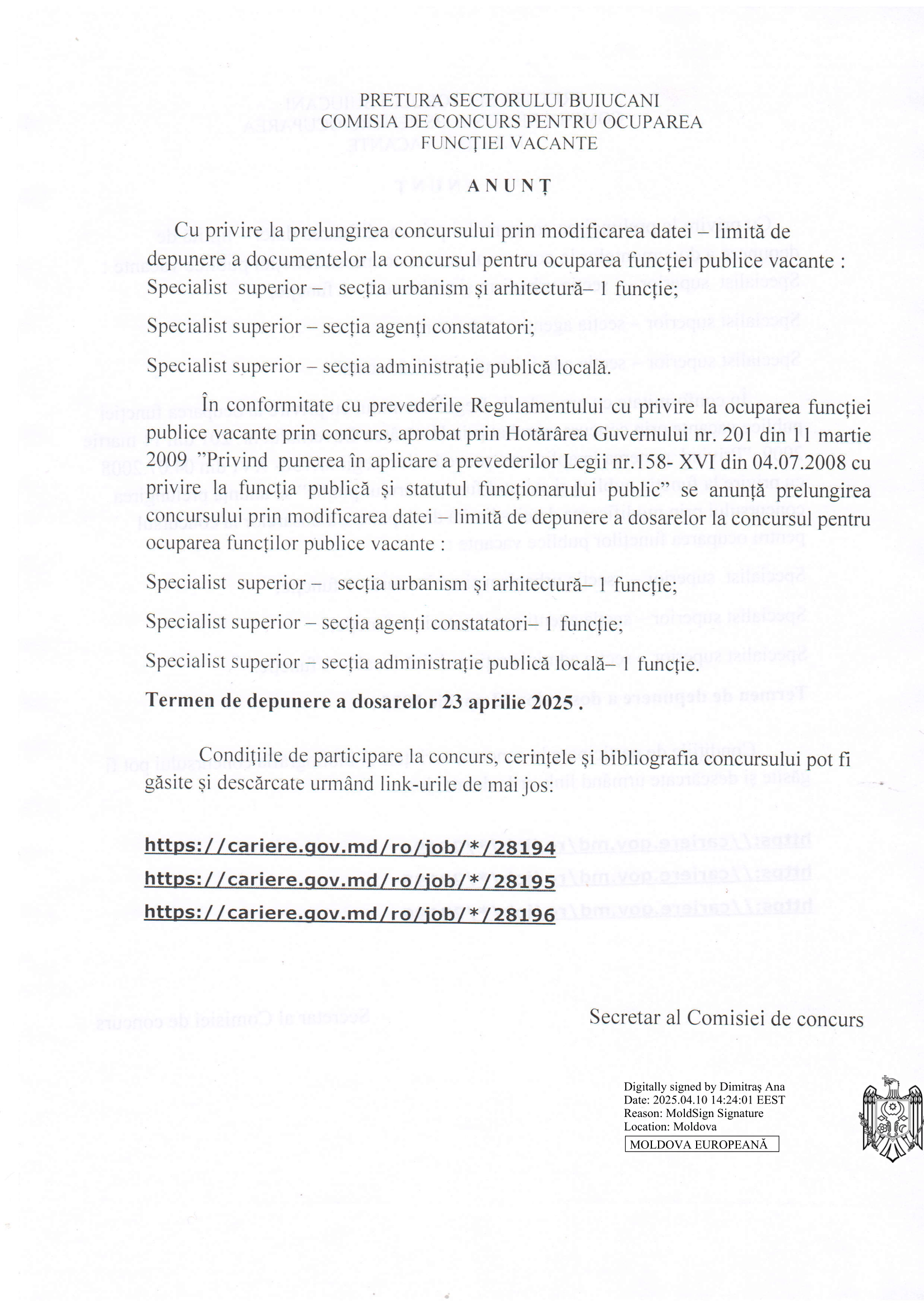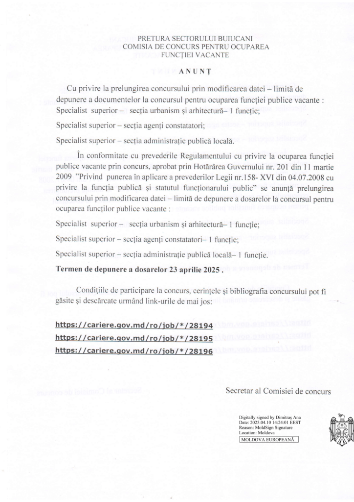 Anunț privind prelungirea datei limită de depunere a dosarelor la concursurile lansate pentru ocuparea funcțiilor publice vacante