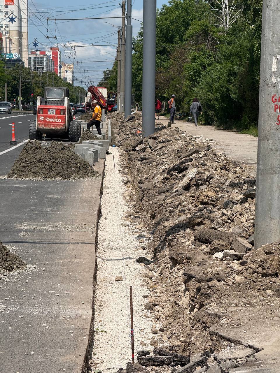 Pe porțiunea cuprinsă între străzile Paris și Sucevița, echipele aplică pavajul, iar pe segmentul dintre Sucevița și O. Ghibu se continuă cu instalarea bordurilor.