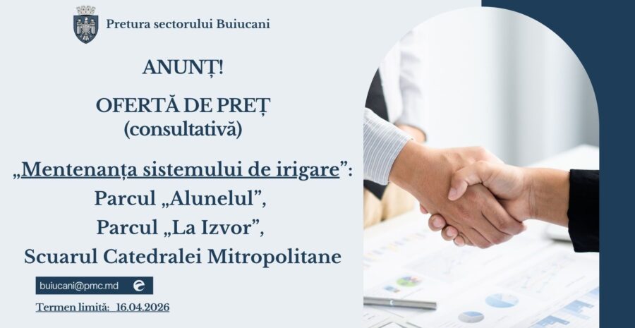 Pretura sectorului Buiucani, în scopul stabilirii valorii estimate pentru achiziția publică „Mentenanța sistemului de irigare” (Parcul „Alunelul”, Parcul „La Izvor”, Scuarul Catedralei Mitropolitane), solicită agenților economici prezentarea ofertelor de preț consultative până la data de 16 aprilie 2026, la adresa electronică: buiucani@pmc.md.